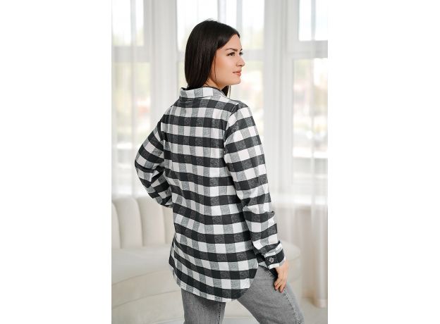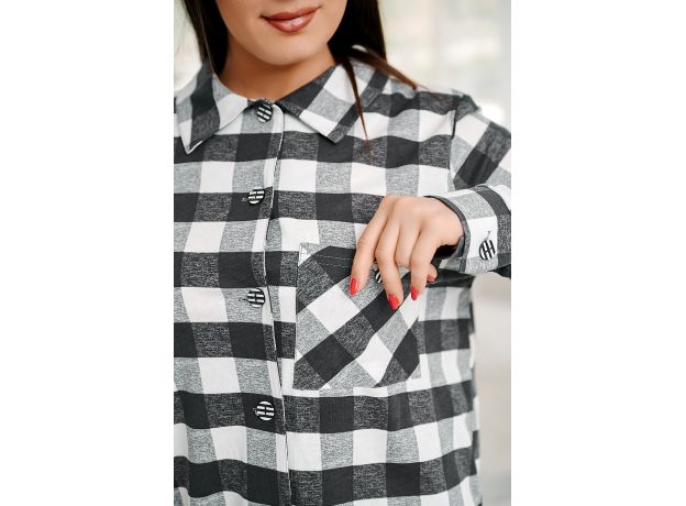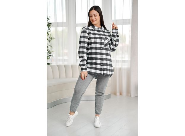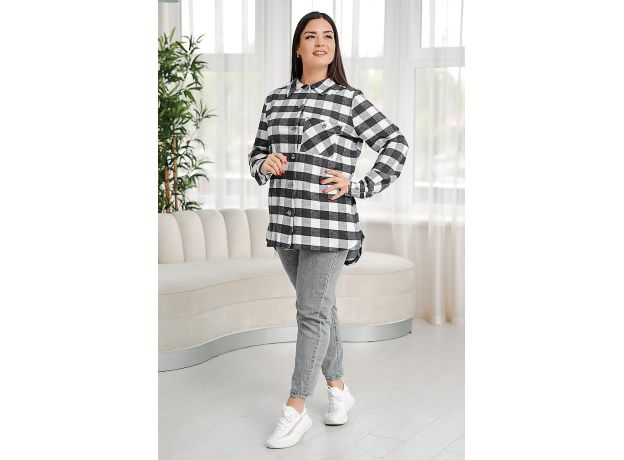 Туника женская прямого силуэта с отложным воротником. Застежка на петли - пуговицы. Рукав длинный, втачной с манжетой. Низ туники фигурный, спинка несколько длиннее полочки. На полочке нагрудный карман. На модели 52 размер