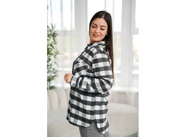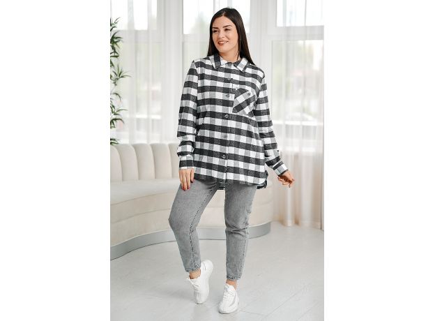 Туника женская прямого силуэта с отложным воротником. Застежка на петли - пуговицы. Рукав длинный, втачной с манжетой. Низ туники фигурный, спинка несколько длиннее полочки. На полочке нагрудный карман. На модели 52 размер
