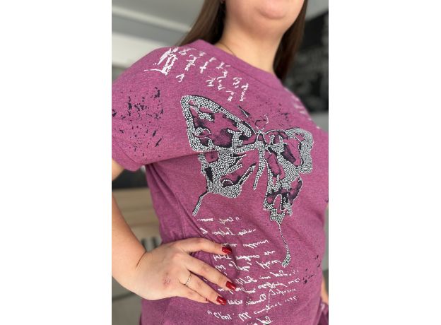 Туника женская прямого силуэта. Рукав цельнокроеный, короткий. На полочке принт. Вырез горловины лодочка. Ширина туники по бедрам регулируется завязками. Горловина, низ рукава обработаны широкой окантовкой. На модели 52 размер