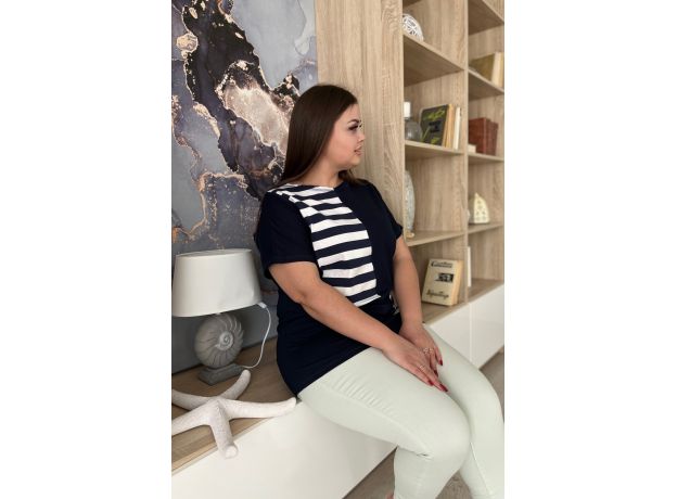 Туника женская прямого силуэта с цельнокроенным коротким рукавом. На полочке вставка и накладной карман из ткани в полоску. На модели 52 размер