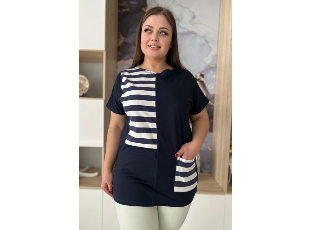 Туника женская прямого силуэта с цельнокроенным коротким рукавом. На полочке вставка и накладной карман из ткани в полоску. На модели 52 размер