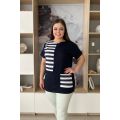Туника женская прямого силуэта с цельнокроенным коротким рукавом. На полочке вставка и накладной карман из ткани в полоску. На модели 52 размер