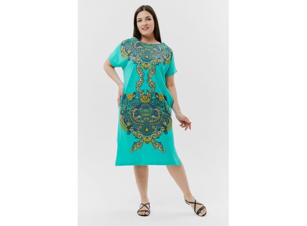 Туника женская прямого силуэта, рукав цельнокроеный короткий, в боковых швах внутренние карманы, внизу - разрезы. На полочке и спинке принт.