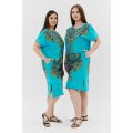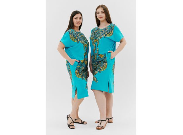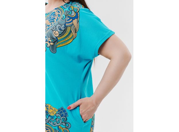 Туника женская прямого силуэта, рукав цельнокроеный короткий, в боковых швах внутренние карманы, внизу - разрезы. На полочке и спинке принт.