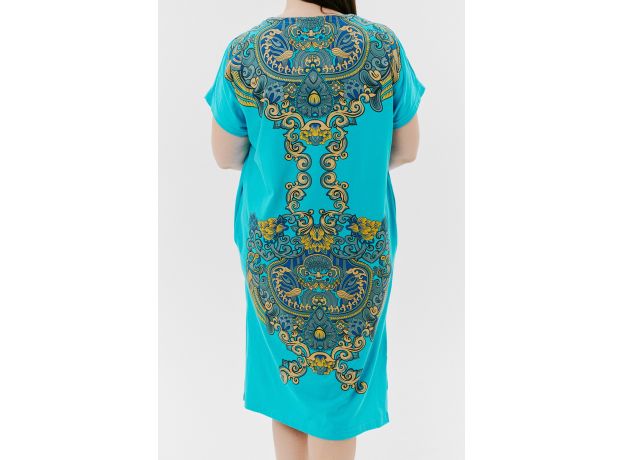 Туника женская прямого силуэта, рукав цельнокроеный короткий, в боковых швах внутренние карманы, внизу - разрезы. На полочке и спинке принт.