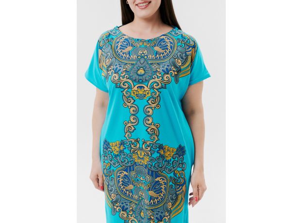 Туника женская прямого силуэта, рукав цельнокроеный короткий, в боковых швах внутренние карманы, внизу - разрезы. На полочке и спинке принт.
