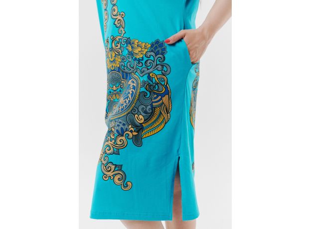 Туника женская прямого силуэта, рукав цельнокроеный короткий, в боковых швах внутренние карманы, внизу - разрезы. На полочке и спинке принт.