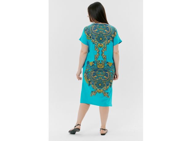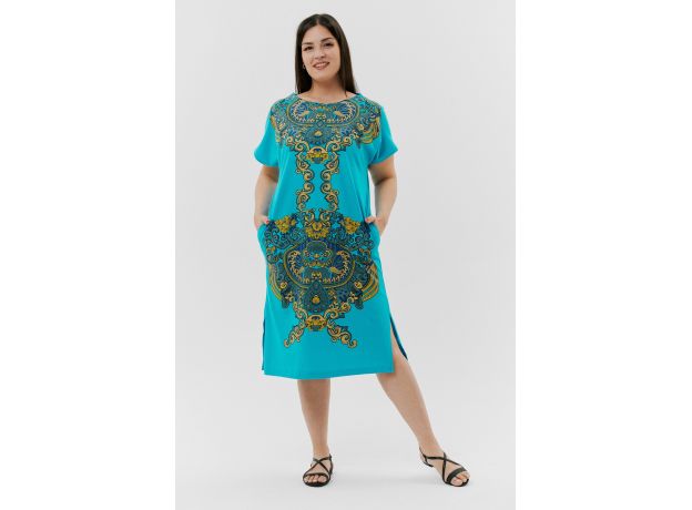 Туника женская прямого силуэта, рукав цельнокроеный короткий, в боковых швах внутренние карманы, внизу - разрезы. На полочке и спинке принт.
