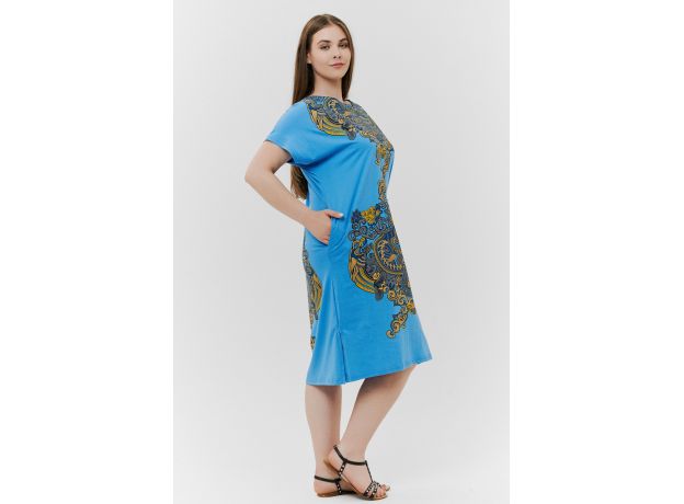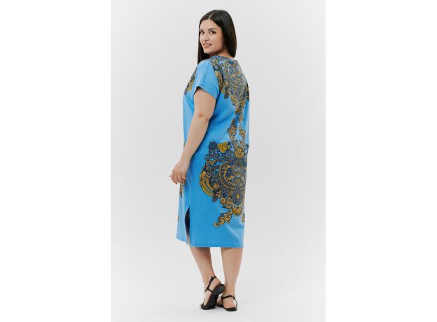 Туника женская прямого силуэта, рукав цельнокроеный короткий, в боковых швах внутренние карманы, внизу - разрезы. На полочке и спинке принт.