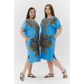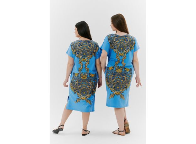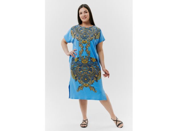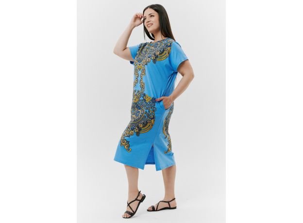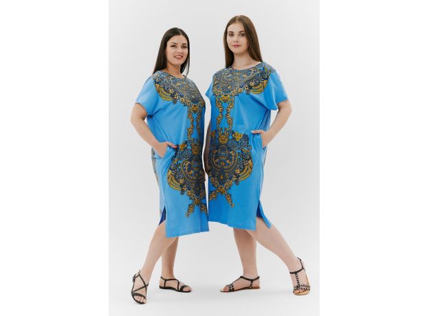 Туника женская прямого силуэта, рукав цельнокроеный короткий, в боковых швах внутренние карманы, внизу - разрезы. На полочке и спинке принт.