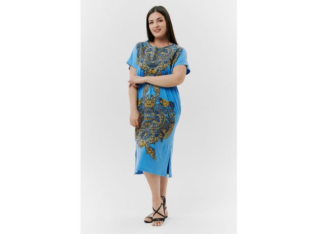 Туника женская прямого силуэта, рукав цельнокроеный короткий, в боковых швах внутренние карманы, внизу - разрезы. На полочке и спинке принт.