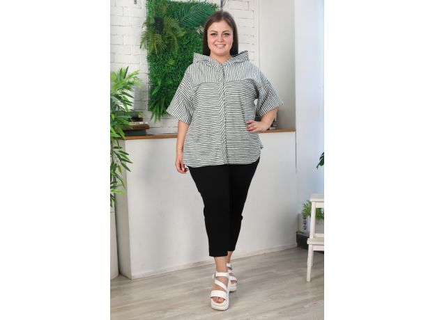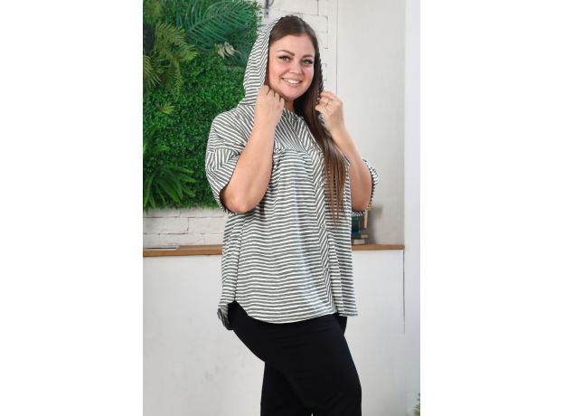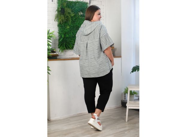 Туника женская, слегка расширенная к низу, с капюшоном. Застежка на петли пуговицы. Рукав со спущенной линией плеча, с цельнокроеной манжетой. На полочке и спинке кокетки. По линии притачивания кокетки полочки два внутренних кармана. Отлет капюшона и борт туники окантован широкой косой бейкой. Туника выполнена из актуальной ткани в полоску.