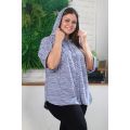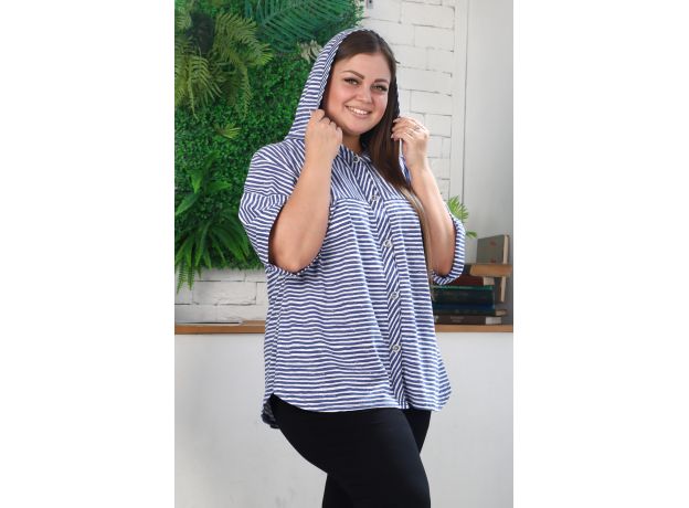 Туника женская, слегка расширенная к низу, с капюшоном. Застежка на петли пуговицы. Рукав со спущенной линией плеча, с цельнокроеной манжетой. На полочке и спинке кокетки. По линии притачивания кокетки полочки два внутренних кармана. Отлет капюшона и борт туники окантован широкой косой бейкой. Туника выполнена из актуальной ткани в полоску.