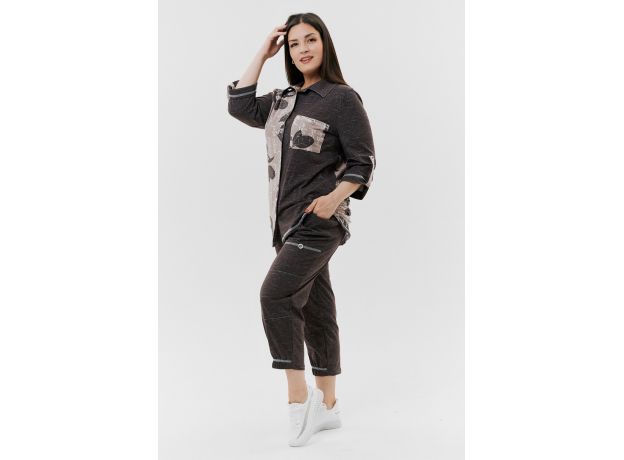 Туника женская прямого силуэта с отложным воротником. Застежка на петли-пуговицы. Рукав втачной, длина  3/4  с манжетой и хлястом. Низ туники фигурный, спинка несколько длиннее полочки. На полочке нагрудный карман.