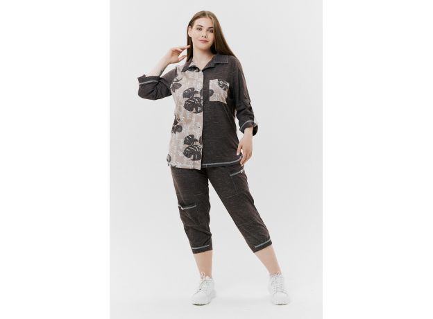 Туника женская прямого силуэта с отложным воротником. Застежка на петли-пуговицы. Рукав втачной, длина  3/4  с манжетой и хлястом. Низ туники фигурный, спинка несколько длиннее полочки. На полочке нагрудный карман.
