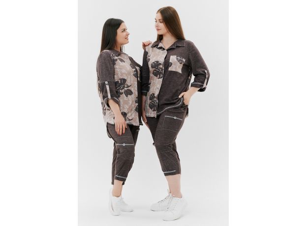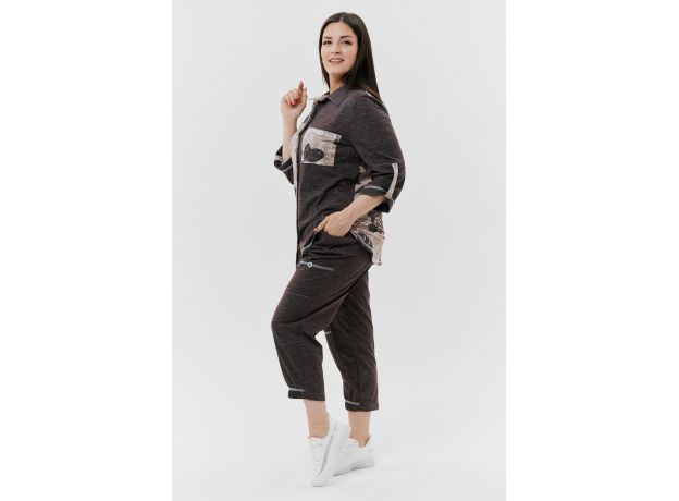 Туника женская прямого силуэта с отложным воротником. Застежка на петли-пуговицы. Рукав втачной, длина 3/4 с манжетой и хлястом. Низ туники фигурный, спинка несколько длиннее полочки. На полочке нагрудный карман.