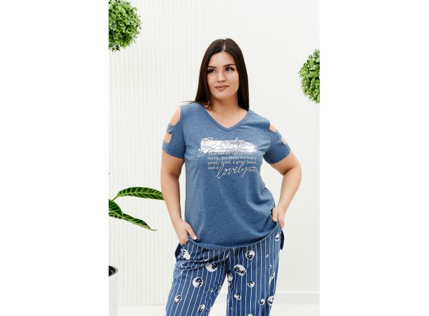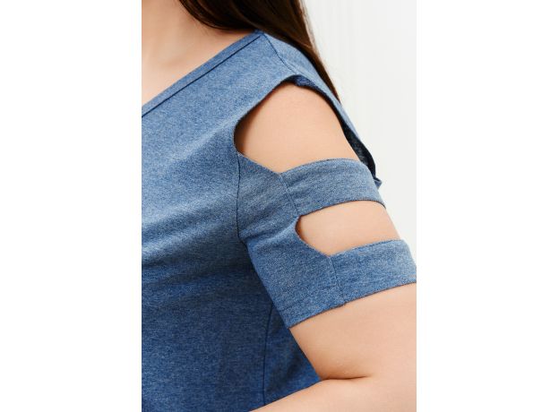 Туника прямого силуэта, вырез Y-образный. Полочка несколько короче спинки, сбоку разрезы. На полочке принт. Рукав не цельный, два хлястика, расположенные через расстояние друг от друга, втачаны в боковые части рукава.