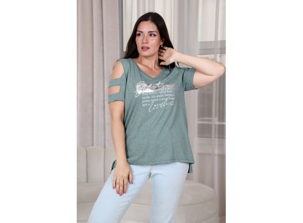 Туника прямого силуэта, вырез Y-образный. Полочка несколько короче спинки, сбоку разрезы. На полочке принт. Рукав не цельный,  два хлястика, расположенные через расстояние друг от друга, втачаны в боковые части рукава.