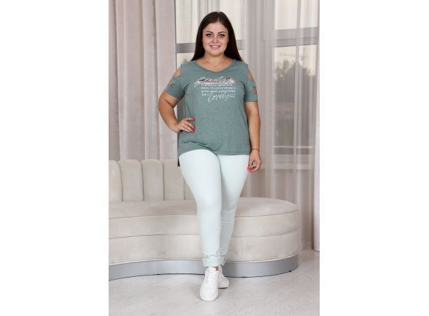 Туника прямого силуэта, вырез Y-образный. Полочка несколько короче спинки, сбоку разрезы. На полочке принт. Рукав не цельный, два хлястика, расположенные через расстояние друг от друга, втачаны в боковые части рукава.