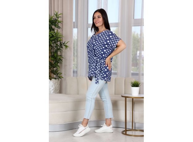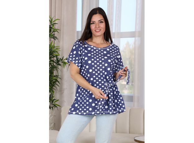 Туника женская, прямого силуэта. Рукав короткий цельнокроенный. Низ изделия регулируется двумя завязками, по боковым швам разрезы
