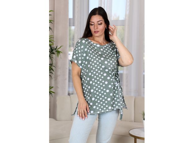 Туника женская, прямого силуэта. Рукав короткий цельнокроенный. Низ изделия регулируется двумя завязками, по боковым швам разрезы