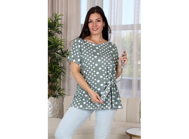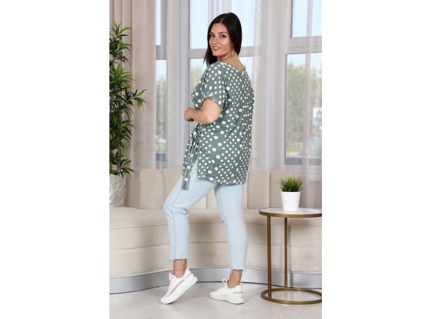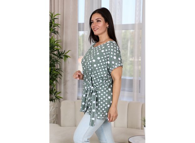 Туника женская, прямого силуэта. Рукав короткий цельнокроенный. Низ изделия регулируется двумя завязками, по боковым швам разрезы