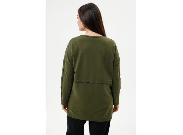 Туника прямого силуэта, горловина круглая, рукав длинный, цельнокроеный со швом, состоит из передней и задней частей. Полочка из четырех частей: на правой части внутренний горизонтальный карман в шве, на левой горизонтальный шов с открытыми срезами, аналогичный шов на спинке. В боковых швах разрезы.