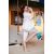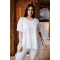 Туника женская, свободная, расклешенная к низу, в стиле бохо. Рукав реглан с тремя складками, на манжете, короткий. Горловина округлая. На полочке два накладных кармана с обтачкой , вверху на кармане встречная складка, внизу сборка. Низ туники фиксируется завязками.