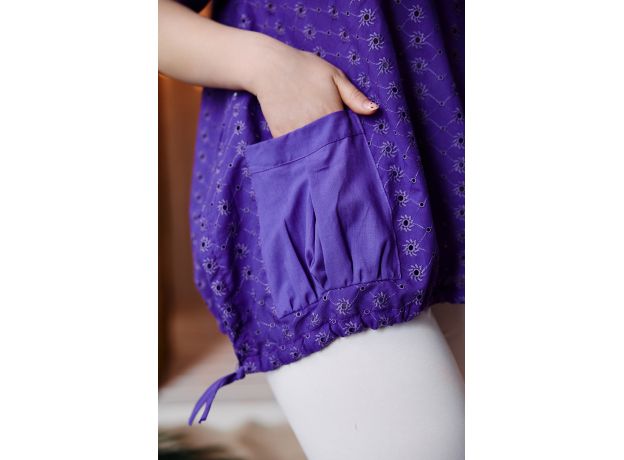 Туника женская, свободная, расклешенная к низу, в стиле бохо. Рукав реглан с тремя складками, на манжете, короткий. Горловина округлая. На полочке два накладных кармана с обтачкой , вверху на кармане встречная складка, внизу сборка. Низ туники фиксируется завязками.