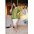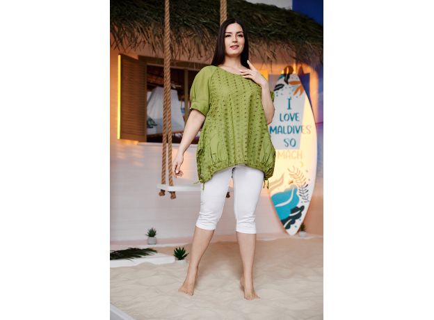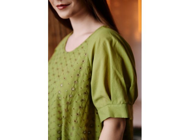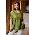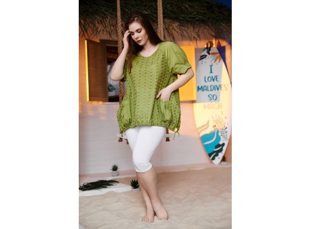 Туника женская, свободная, расклешенная к низу, в стиле бохо. Рукав реглан с тремя складками, на манжете, короткий. Горловина округлая. На полочке два накладных кармана с обтачкой , вверху на кармане встречная складка, внизу сборка. Низ туники фиксируется завязками.