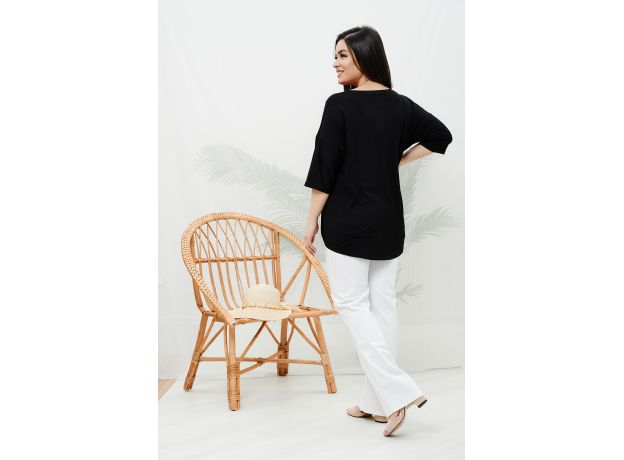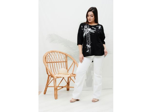 Туника женская прямого силуэта. Рукав цельнокроеный со швом. Горловина округлая. Низ фигурный. На полочке модный принт.