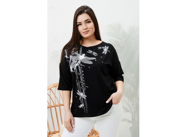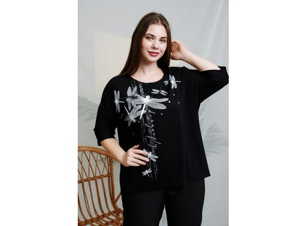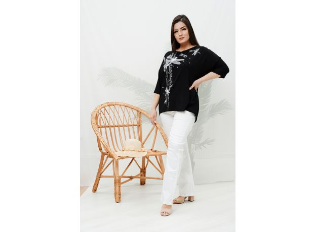 Туника женская прямого силуэта. Рукав цельнокроеный со швом. Горловина округлая. Низ фигурный. На полочке модный принт.