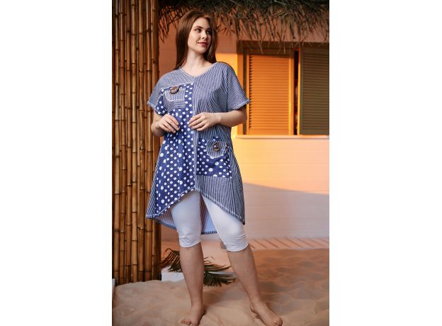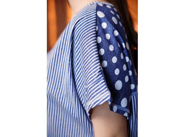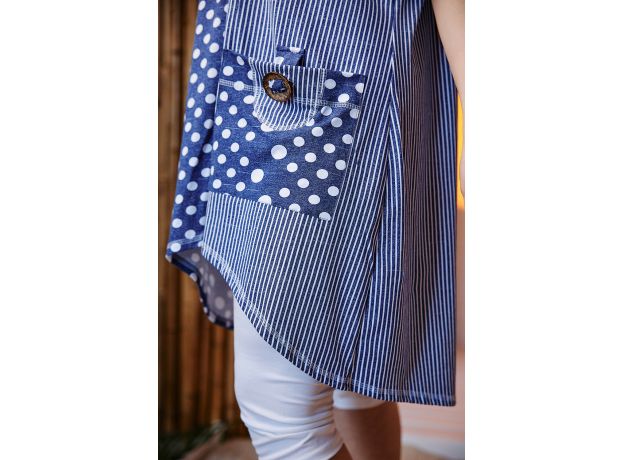 Туника женская, свободная, к низу расширенная. Рукав цельнокроеный короткий. Горловина Y-образная. Туника из двух полочек, одна полочка и кокетка спинки: в горошек, другая полочка, кокетка полочки и спинка: в полоску. На полочке в полоску большой накладной карман из ткани в горошек с декоративной кокосовой пуговицей на вертикальном хлясте. На полочке в горошек нагрудный карман в полоску с хлястом и декоративной кокосовой пуговицей. На спинке сзади складка для обеспечения достаточной свободы по бедрам. Низ туники фигурный, полочка короче спинки.