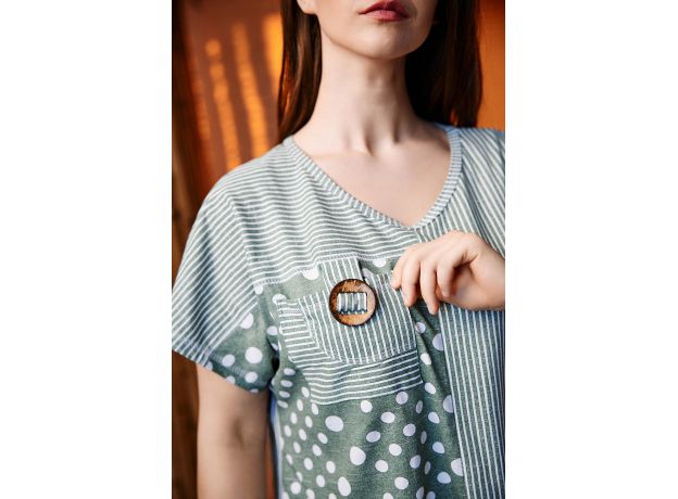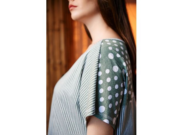 Туника женская, свободная, к низу расширенная. Рукав цельнокроеный короткий. Горловина Y-образная. Туника из двух полочек, одна полочка и кокетка спинки: в горошек, другая полочка, кокетка полочки и спинка: в полоску. На полочке в полоску большой накладной карман из ткани в горошек с декоративной кокосовой пуговицей на вертикальном хлясте. На полочке в горошек нагрудный карман в полоску с хлястом и декоративной кокосовой пуговицей. На спинке сзади складка для обеспечения достаточной свободы по бедрам. Низ туники фигурный, полочка короче спинки.