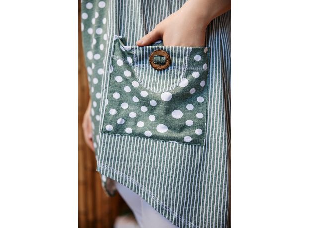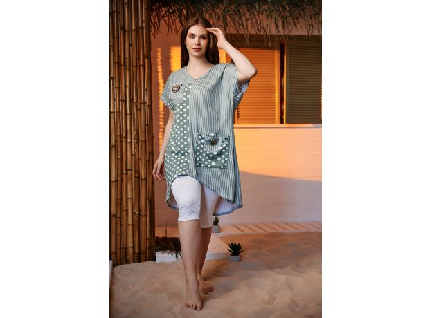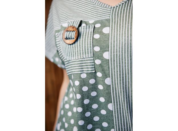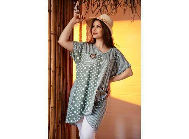 Туника женская, свободная, к низу расширенная. Рукав цельнокроеный короткий. Горловина Y-образная. Туника из двух полочек, одна полочка и кокетка спинки: в горошек, другая полочка, кокетка полочки и спинка: в полоску. На полочке в полоску большой накладной карман из ткани в горошек с декоративной кокосовой пуговицей на вертикальном хлясте. На полочке в горошек нагрудный карман в полоску с хлястом и декоративной кокосовой пуговицей. На спинке сзади складка для обеспечения достаточной свободы по бедрам. Низ туники фигурный, полочка короче спинки.