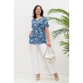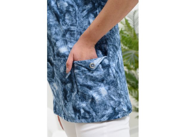Туника женская полуприлегающего силуэта. Горловина округлая. Рукав втачной короткий. На полочке  рельефы. Между боковым швом  и рельефом карман. Отворот верхнего среза кармана зафиксирован пуговицей.