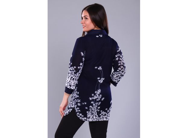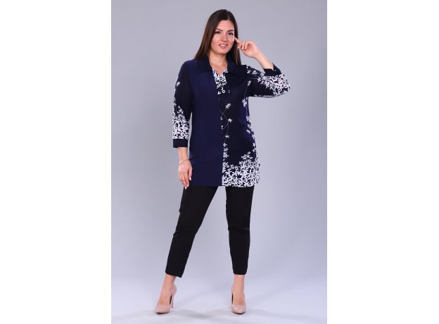 Туника комбинированная, рукав 3/4 с манжетом, отложной воротничок, низ изделия округлый.