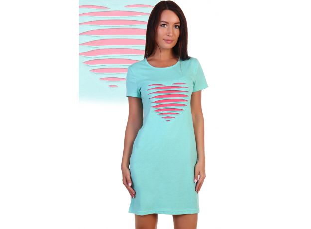 Туника из кулирки с добавлением лайкры. Рукава короткие, общая длина до середины бедра. На груди стилизованное изображение сердца из разрезов
