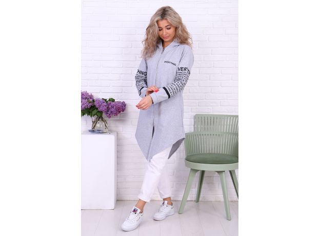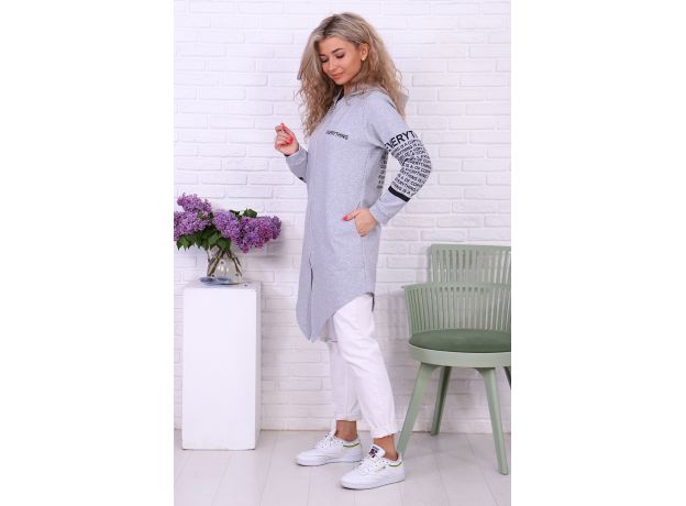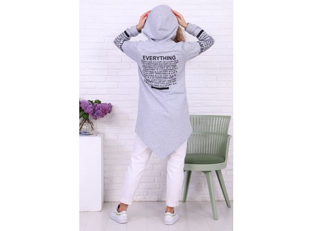 Туника необычного кроя из футера с лайкрой. Длинные рукава, общая длина до коленей спереди, более коротко по бокам. На молнии, с капюшоном. Дизайн в виде принтов с надписями