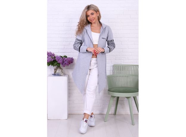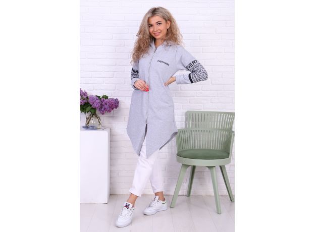 Туника необычного кроя из футера с лайкрой. Длинные рукава, общая длина до коленей спереди, более коротко по бокам. На молнии, с капюшоном. Дизайн в виде принтов с надписями