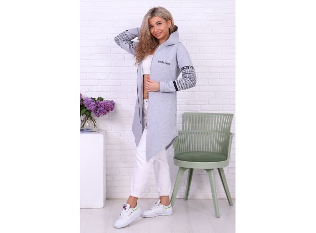 Туника необычного кроя из футера с лайкрой. Длинные рукава, общая длина до коленей спереди, более коротко по бокам. На молнии, с капюшоном. Дизайн в виде принтов с надписями