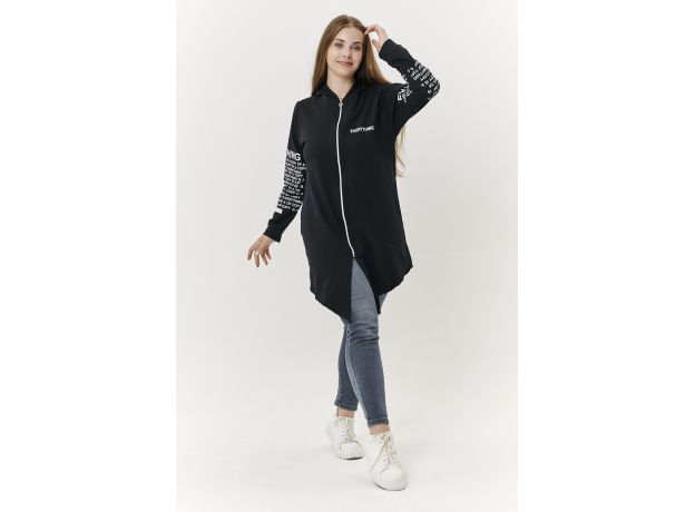 Туника необычного кроя из футера с лайкрой. Длинные рукава, общая длина до коленей спереди, более коротко по бокам. На молнии, с капюшоном. Дизайн в виде принтов с надписями
