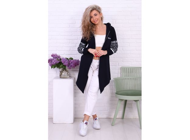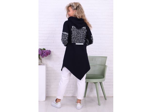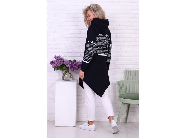 Туника необычного кроя из футера с лайкрой. Длинные рукава, общая длина до коленей спереди, более коротко по бокам. На молнии, с капюшоном. Дизайн в виде принтов с надписями