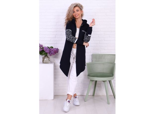 Туника необычного кроя из футера с лайкрой. Длинные рукава, общая длина до коленей спереди, более коротко по бокам. На молнии, с капюшоном. Дизайн в виде принтов с надписями