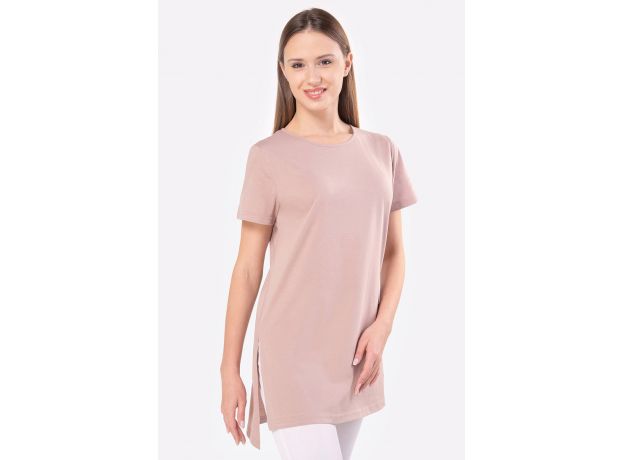 Удлиненная женская футболка. Длинная однотонная футболка с разрезами по бокам и короткими рукавами. Футболки для женщин за счет разрезов просто созданы для комфорта: в них удобно заниматься спортом, проявлять любую активность дома и на улице. Женская футболка прекрасна и для отдыха на диване. Футболку можно частично заправлять в джинсы или юбку, создавая актуальный образ. Базовая женская футболка на все случаи жизни. Длина футболки сзади доходит до середины бедра. Натуральный хлопок, ткань высокого качества очень приятна на ощупь. Размерный ряд: 44, 46, 48, 50, 52. Параметры модели: - 171, 86/60/87. На ней одежда размера 44.