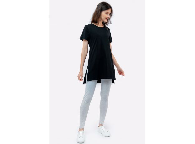 Удлиненная женская футболка. Длинная однотонная футболка с разрезами по бокам и короткими рукавами. Футболки для женщин за счет разрезов просто созданы для комфорта: в них удобно заниматься спортом, проявлять любую активность дома и на улице. Женская футболка прекрасна и для отдыха на диване. Футболку можно частично заправлять в джинсы или юбку, создавая актуальный образ. Базовая женская футболка на все случаи жизни. Длина футболки сзади доходит до середины бедра. Натуральный хлопок, ткань высокого качества очень приятна на ощупь. Размерный ряд: 44, 46, 48, 50, 52. Параметры модели:  - 171, 86/60/87. На ней одежда размера 44.