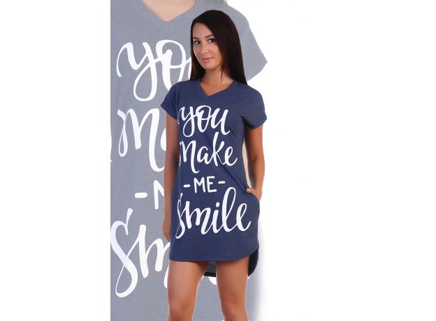Туника из кулирки. Принт на груди в виде надписи. Короткие рукава, общая длина по середину бедра. Размеры от 44 до 54