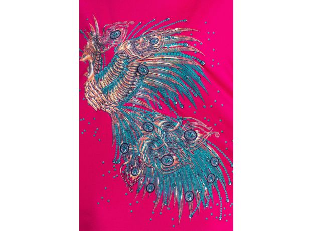 Туника из вискозы с широкими рукавами. Принт в виде сказочной птицы с орнаментами, общая длина до середины бедра, рукав короткий. Пять расцветок бирюзовая, малиновая, ментоловая, фуксия и шоколадная