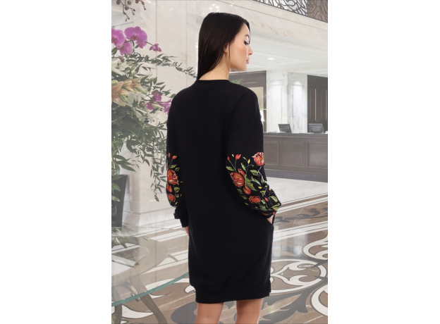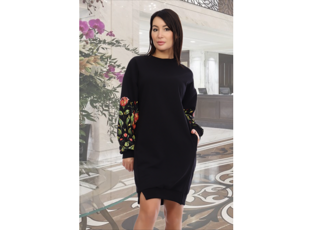 Удлинённая демисезонная туника. Является фаворитом текущего модного сезона, так как соответствует тенденциям этого года. Она выделяется простотой, минимализмом и свободным кроем. Длинный рукав с напуском на манженах из кашкорсе. В рельефных швах внутренние карманы. На уровне колен разрезики на манжете из кашкорсе. На рукавах принт из роз, в лепестках которых золотой глиттер. Оттенок ткани в расцветке изумруд может отличаться