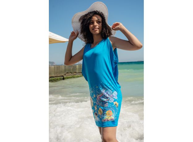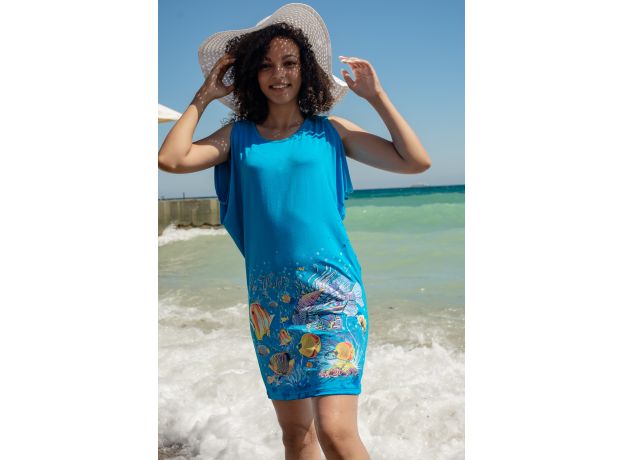 Свободная туника из вискозы. Принт в виде тропических рыбок, длина до середины бедра, рукава отсутствуют